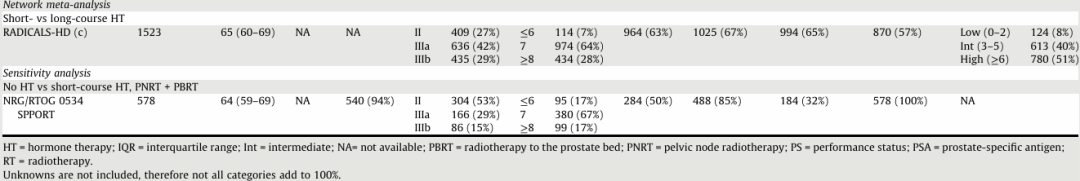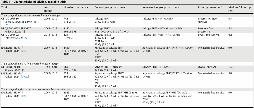 研究共纳入五项已完成的RCT(RADICALS-HD、RTOG 9601、RTOG 0534、GETUG-AFU-16和GETUG-AFU-22)的结果。所有试验的中位随访时间为6.2~13年。研究中的患者分别接受短期内分泌治疗和无内分泌治疗(四项试验对照,3489名患者)或长期内分泌治疗和无内分泌治疗(两项试验对照,1088名患者)。RADICALS-HD研究比较了短期内分泌治疗和长期内分泌治疗(1523名患者),允许进行挽救性放疗或辅助性放疗。其余所有试验均采用了前列腺床挽救性放疗;两项试验还采用了淋巴结放疗。同步内分泌治疗的使用情况因试验而异。