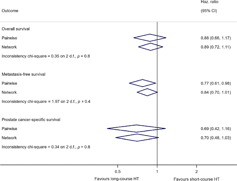 RADICALS-HD试验对长期与短期内分泌治疗进行了比较,这为网络荟萃分析提供了额外的1523名患者,其中OS、MFS和PCSS分别增加了211、313和65个额外事件。长期内分泌治疗与短期内分泌治疗的疗效网络估计HR分别为:OS(95%CI=0.72–1.11,P=0.3)、MFS(95%CI=0.70–1.01,P=0.06)和PCSS(95%CI=0.48–1.03,P=0.07)。这意味着,长期内分泌治疗8年后OS、MFS和PCSS的估计绝对改善为1.5%–3%。排除放疗前PSA水平>2 ng/ml的患者进行的探索性分析也得到了类似结果。