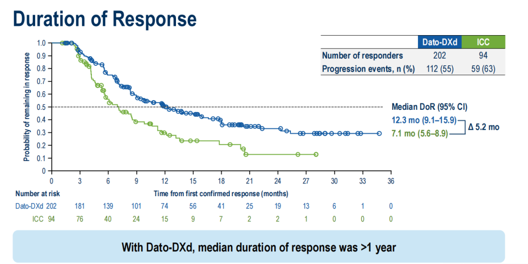 此外,Dato-DXd在缓解率和缓解持续时间上也显著优于化疗组。Dato-DXd组经证实的ORR是ICC组的2倍以上(62.5%vs29.3%),经证实的完全缓解率是ICC组的3倍以上(9.0%vs 2.5%)此外,Dato-DXd组中位DoR达12.3个月,远超化疗组的7.1个月。这些数据表明,Dato-DXd不仅起效快且疗效持久。