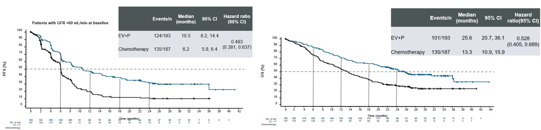 对于合并肾功能不全的患者,维恩妥尤单抗联合方案组中位PFS为化疗组的1.7倍(10.5个月vs 6.2个月,HR 0.49),中位OS为化疗组的2倍(25.6个月vs 13.3个月,HR 0.53),ORR几乎翻倍(66.3%vs 38.2%)[5]