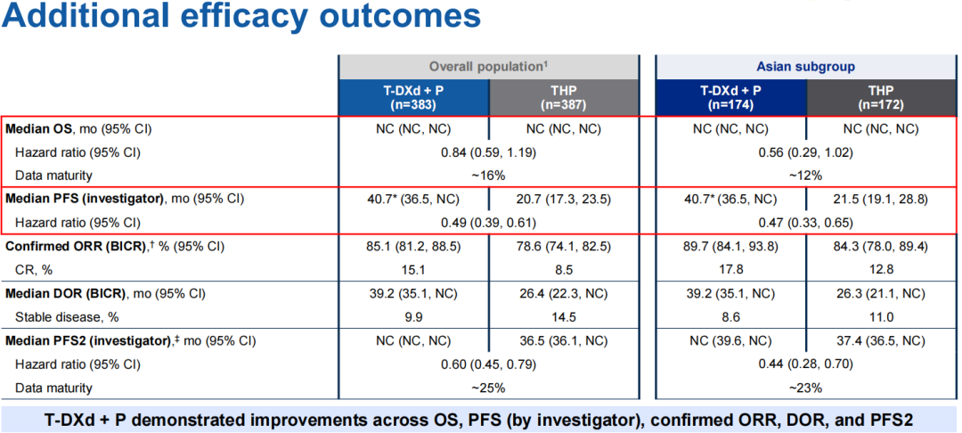 而在次要疗效终点之一的客观缓解率(ORR)方面,T-DXd+P组ORR为89.7%,其中完全缓解(CR)率为17.8%,两项数据均高于THP组(84.3%/12.8%),且T-DXd+P组患者中位缓解持续时间(mDOR)长达39.2个月,较THP组延长mDOR超过1年(26.4个月)。