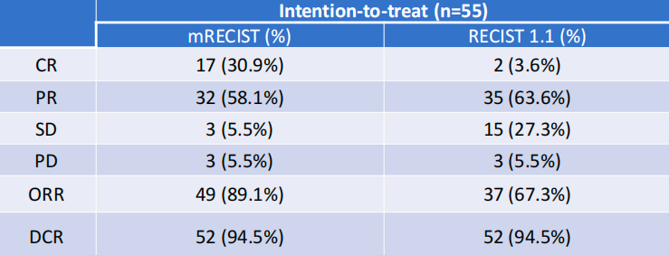 根据RECIST 1.1和mRECIST评估的最佳缓解情况