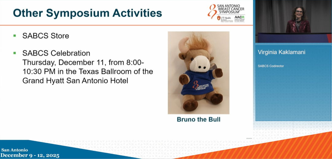 此外,Virginia Kaklamani教授表示,SABCS一直致力于支持年轻科学家,通过设立多个旅行奖,为年轻科研人员提供参会机会,使其接触乳腺癌研究与治疗前沿。今年将延续去年的“鸭子抽奖”活动,目前已售出超过700只鸭子,所得收益将用于年轻研究者旅行资助。去年共颁发20项旅行资助,今年有望进一步增加。当地时间12月11日(周四)将公布抽奖获奖者,同时设有10个奖项,敬请期待。Virginia Kaklamani教授还透露,会议周边商店的收益也将用于旅行资助和年轻研究者支持,今年吉祥物“Bruno the Bull”大受欢迎,几乎售罄。