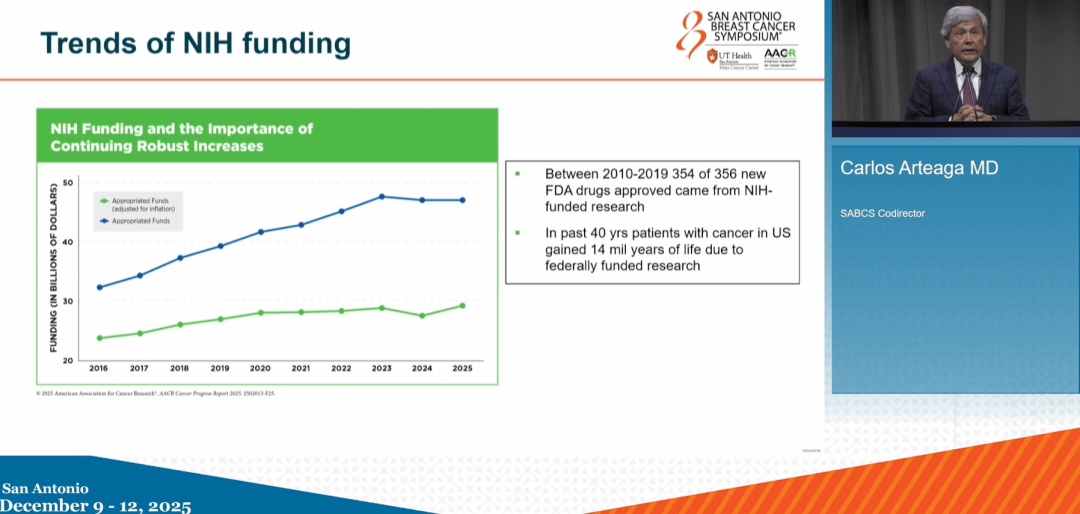 然而,乳腺癌健康差异问题仍需关注。高影响力新药注册试验中,黑人和西班牙裔患者的入组率低于其他种族和族裔群体,这是未来需要改进的方向。过去几年,乳腺癌领域取得了多项药物批准成果,如Imlunestrant、Inavolisib和Dato-DXd等,这些成果离不开科研人员的努力。Arteaga教授还提到,NIH(美国国立卫生研究院)的资助面临挑战,其资助增长相对平缓,调整通胀后甚至呈下降趋势。AACR一直在努力推动增加资助,最近的民意调查显示,89%的选民支持联邦对NIH的资助。目前,美国国会正在提议增加NIH和NCI(美国国家癌症研究所)2026财年的资助,与政府提出的40%削减形成对比。最后,Carlos Arteaga教授呼吁乳腺癌社区发出声音,影响资助政策。