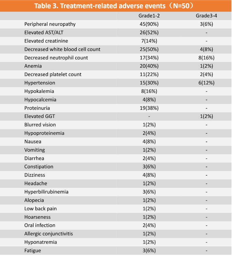 常见任何级别不良事件包括周围神经病变(96.0%)、血液学毒性(白细胞减少58.0%,中性粒细胞减少50.0%,贫血42.0%)及肝功能异常(ALT/AST升高52.0%);3级事件以中性粒细胞减少(16.0%)、高血压(12.0%)为主,周围神经病变(6.0%),未发生≥4级治疗相关不良事件。