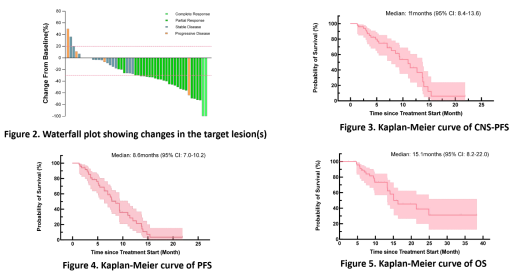 截至2025年6月30日(中位随访14个月),CNS-ORR为54.0%,CNS-DCR为92.0%;中位PFS为8.6个月(95%CI:7.0-10.2),中位CNS-PFS为11.0个月(95%CI:8.4-13.6),中位OS为15.1个月(95%CI:8.2-22.0)。