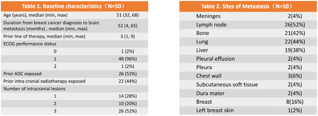 2022年5月至2025年4月共入组50例可评估患者(中位年龄52岁)。患者基线特征:中位既往治疗线数3线,脑转移灶数量分布为单灶(14例)、双灶(10例)、≥3灶(26例);56%(28/50)未接受放疗,44%(22/50)放疗后进展,52%(26/50)既往接受过ADC治疗。