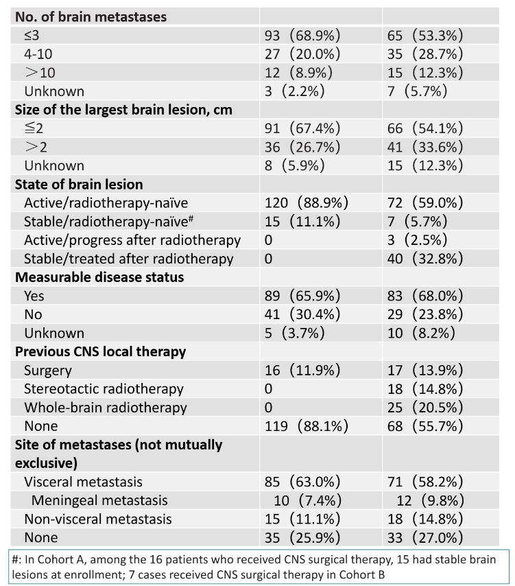 2018年9月至2024年1月,本研究共入组287例患者,其中队列A为135例、队列B为122例。两组患者的活动性脑转移比例分别为88.9%和61.5%,合并中枢神经系统症状的比例分别为27.4%和52.5%。