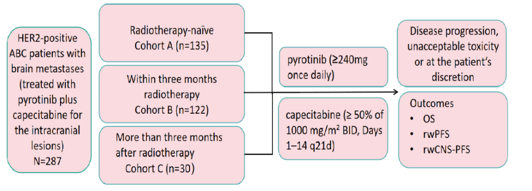 这是一项中国41个中心参加的多中心、回顾-前瞻双向的真实世界研究(NCT05359120)。该研究纳入确诊为HER2阳性乳腺癌伴脑转移,且在医院电子病历系统中具有完整诊断和治疗记录的患者。根据开始行全身系统治疗时脑部放疗的状态,入组患者被分为三个队列:未接受过放疗的患者(队列A)、在全身系统治疗开始3个月内接受全脑放疗(WBRT)和/或立体定向放疗(SRS)的患者(队列B),以及在放疗结束3个月后开始接受全身系统治疗的患者(队列C)。系统治疗方案定义为吡咯替尼(起始≥240 mg/天)联合卡培他滨(起始剂量≥500 mg/m²,每日两次,第1-14天,每21天为一周期),治疗持续至疾病进展、出现不可耐受的毒性或患者撤回知情同意。研究终点包括总生存期(OS)、无进展生存期(PFS)及中枢神经系统PFS(CNS-PFS)。本文报告队列A和队列B的研究结果。