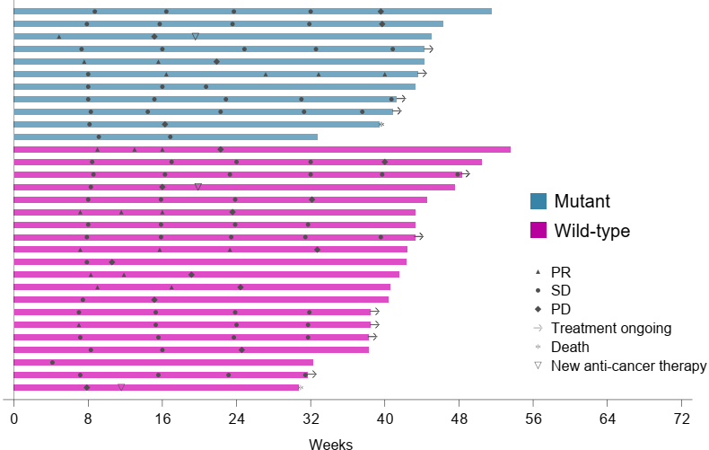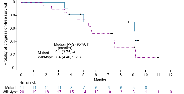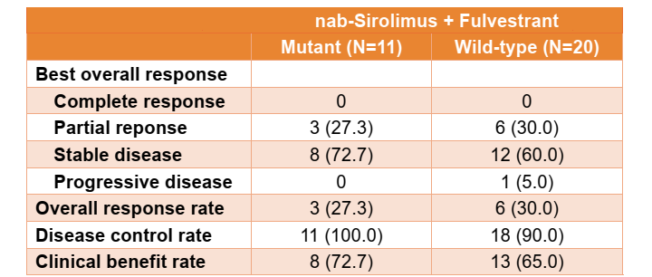 在nab-sirolimus+氟维司群队列中,11例具有PIK3CA/AKT1/PTEN改变的疗效可评估患者显示活性改善:中位PFS为9.1个月。20例PI3K/AKT/mTOR野生型患者的中位PFS为7.4个月,ORR为30.0%(图2,表3)