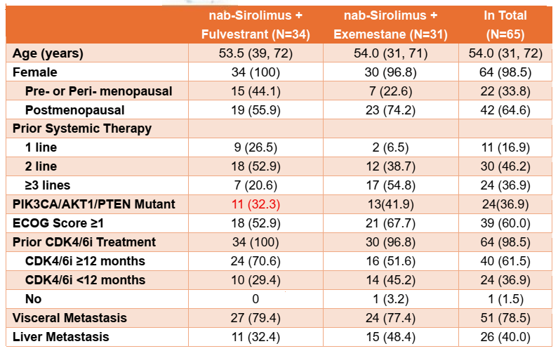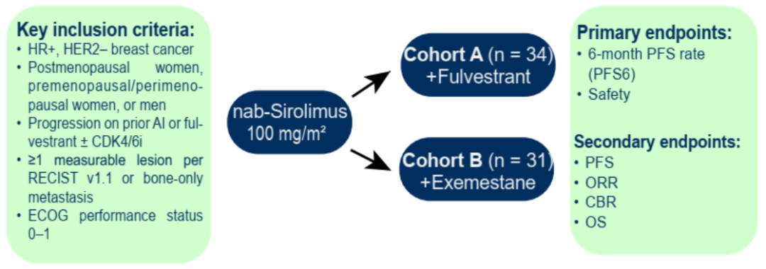 本研究纳入AI/氟维司群±CDK4/6i治疗失败的HR+/HER2-晚期乳腺癌患者。既往AI±CDK4/6i失败的患者接受nab-sirolimus+氟维司群治疗,而氟维司群±CDK4/6i失败的患者接受nab-sirolimus+依西美坦治疗(图1)。
