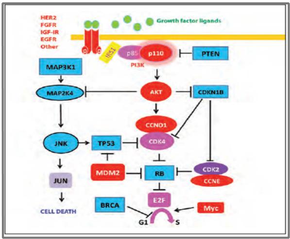 细胞周期蛋白依赖性激酶家族(CDKs)是参与肿瘤细胞周期进程和调控的重要信号分子,在肺鳞癌患者中,cyclin D1扩增型突变约占12%,CDK4扩增型突变约占1%,Palbociclib是选择性CDK4/6抑制剂,已获批应用于雌激素受体阳性的转移性乳腺癌患者。目前有一项II/III期临床研究NCT02154490正在比较Palbociclib和传统化疗在CDK4/6突变型晚期肺鳞癌患者中的疗效。