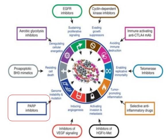 聚腺苷酸二磷酸核糖转移酶-1[poly(ADP-ribose)polymerase-1,PARP-1]是存在于真核细胞中催化聚ADP核糖化的细胞核酶,它参与的聚ADP核糖化是真核细胞中蛋白质翻译后的重要修饰方式之一。PARP-1在DNA修复和细胞凋亡中发挥至关重要的作用。PARP-1的缺失使细胞对DNA损伤因子易感,可能参与肿瘤的发生。有研究表明抑制PARP-1可导致未修复的SSBs的累积,从而造成DNA双链的断裂,进而导致肿瘤细胞死亡。一项III期临床研究发现,PARP-1抑制剂Iniparib在晚期肺鳞癌患者中OS的风险比与吉西他滨/卡珀对照组相比为1.08。而另一项比较Iniparib联合吉西他滨/顺珀与化疗组疗效的II期研究同样没有得出阳性结果。