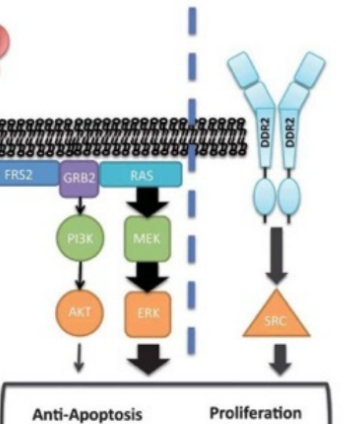 DDR2系受体酪氨酸蛋白激酶,DDR2与其配体结合诱导细胞内磷酸化,引起多效性的信号传导。研究人员在美国癌症研究学会(AACR)第102届年会上,介绍了肺麟状细胞癌患者的DDR2基因突变可能对达沙替尼有效。在这项研究中,Dana-Farber癌症研究所的科学家们研究了290例麟状细胞癌样本,并确定了3.8% (n= 11)存在DDR2突变,277个肺麟癌细胞株样有3.2%(n=9)有DDR2突变。尽管有体外研究证实多靶点抑制剂Dasatinib 和Nilotinib对具有DDR2突变的细胞株具有抗肿瘤效果,然而临床试验没有证实其疗效。尽管如此,DDR2仍可作为晚期肺鳞癌的潜在治疗靶点,值得进一步研究。