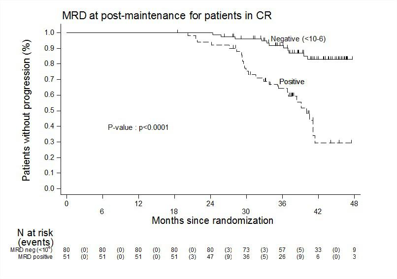 VRD具有更强的抗骨髓瘤活性且耐受性良好,既往Ⅱ期研究(JCO,2014)显示高达68%的患者获得流式MRD阴性的CR。IFM/DFCI 2009 Ⅲ期临床研究中比较应用七色流式细胞(FCM)和二代测序(NGS)作为微小残留病检测的手段(大会摘要号:191)。FCM的敏感性为10-4低于NGS的10-6。FCM阴性的患者进一步应用NGS检测分组,维持治疗前FCM-/NGS-和FCM-/NGS+患者的3年PFS分别为86%和66%,而维持治疗后两组的3年PFS分别为91%和65%;均获得较好的长期疗效。因而包含IFM/DFCI的多个研究组织目前将VRD作为推荐的方案,特别是高危患者;同时显示NGS具有更好地预后预测价值。