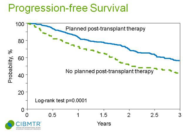 Robert Frank Cornell等分析了CIBMTR 2008~2013年分别接受RD (178)、VD (161)、 CVD (84)或VRD (270)等方案诱导并一线单次ASCT治疗的693例NDMM患者(大会摘要号:396),部分患者移植后来那度胺(R)或硼替佐米(V)维持治疗。中位移植后随访时间36个月。总体来说,无论选择何种诱导方案,ASCT前/后各组间治疗反应无显著差别;VRD较CVD降低复发风险(HR=0.68,P=0.04);高危细胞遗传学(HR=0.57,P=0.0004)和无维持治疗(HR=1.55,P=0.0008)是复发的的高危危险因素。接受计划ASCT后维持治疗者显著提高3年PFS(55% vs. 39%,P=0.0001)。结果提示包含诱导/巩固强化/维持的整体治疗是较诱导方案选择更重要的影响疗效的因素。