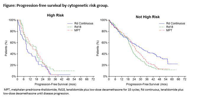 对于不适合移植新诊断患者(NDMM)同样显示持续治疗的重要性。FIRST(MM-020)研究(大会摘要号:730)首次公布其细胞遗传学对疗效影响的结果,762例有细胞遗传学资料患者中位随访时间40.2个月。和MPT组比较,Rd持续治疗降低了24%死亡或进展风险;在遗传学非高危组,降低风险比例增高到32%。在非高危组,三者的中位PFS分别为31.1、21.2和24.9个月。对于高危患者,三组的OS相当。无论遗传学分类,Rd持续治疗比MPT治疗反应率高,且在高危患者中获得更多的高质量治疗反应。Rd持续治疗的安全性好,绝大多数不良反应是短暂、可控的,且在不同遗传学组中无差别。结果支持Rd持续治疗作为不适合移植NDMM患者的标准治疗,特别是非遗传学高危的患者。