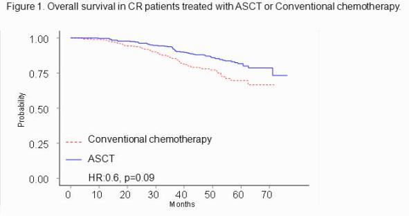 意大利都灵大学Roberto Mina等分析了5项Ⅲ期临床研究(大会摘要号:927),包含RV-MM-209、RV-MM-EMN-441、MM-BO2005、GIMEMA-MM0305和EMN01研究的2439例NDMM患者。383例ASCT和273例化疗患者获得CR。5年OS ASCT组有优于化疗组的趋势(79% vs. 69%,HR=0.6,P=0.09)。即使是获得CR的患者,ASCT组的中位PFS显著优于化疗组(59 vs. 47个月,HR=0.54,P=0.008);而化疗获得CR的患者,无论时年轻或老年患者其PFS无差别。结果提示ASCT较化疗获得更深程度的CR水平,转化为提高PFS和OS。