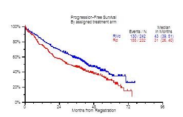 对于高危细胞遗传学患者,将Rd持续治疗作为基石的基础上联合另一个新药,PFS和OS可能获益;观点得到美国多中心、Ⅲ期临床、随机对照研究(SWOG S0777,大会摘要号:25)的结果证实。474例NDMM患者随机入组接受VRd(21天/疗程,6个疗程)或Rd(28天/疗程,8个疗程)诱导治疗,随后均Rd持续维持治疗至疾病进展。VRd组OS获益(R=0.666;P=0.0114)。中位PFS分别为43个月(VRd)和31个月(Rd);中位OS 分别为未达到VRd)和63 个月(Rd)。