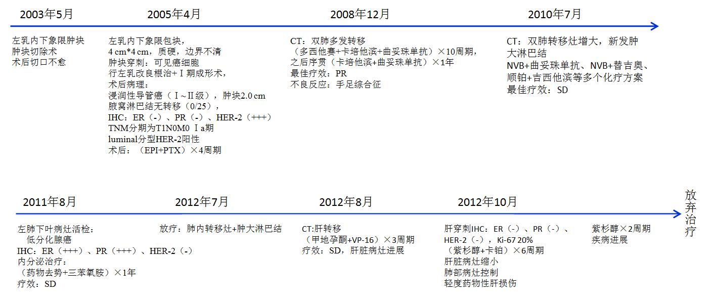 根据以上治疗经过得到两点体会:①如果患者出现新发病灶,在条件允许时应该给予活检,在最新病理结果指导下给予治疗;②如果出现单一的转移病灶,在全身治疗使患者病情得到控制的前提下,可与外科或放疗科进行多学科的协作,加强局部控制。但对于肺和肝的多发转移治疗选择不够多。