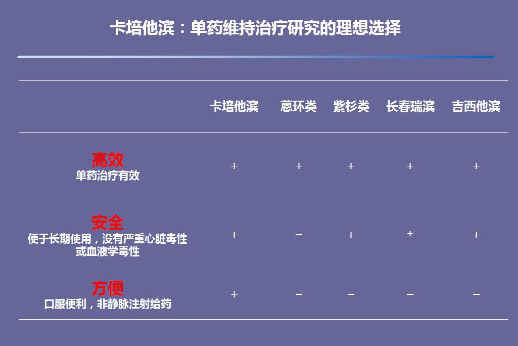 兰波教授:对于初治的晚期乳腺癌患者,给予一线化疗方案治疗4~6个周期后,如果患者获益(达到CR或PR或SD),之后可以选择高效、低毒、给药方便的化疗药物作为维持治疗直到患者疾病出现进展。2010年ESMO会议报告一项对转移性乳腺癌的meta分析(Gennari A et al. ESMO 2010 Abst 2760.)显示延长化疗方案的使用时间可以明显改善患者的PFS和总生存率。那么,究竟哪种药物可作为维持治疗的而药物呢?目前乳腺癌的一线治疗药物有五大类:卡培他滨、长春瑞滨、紫杉类药物、蒽环类药物和吉西他滨,虽然这五种药物单药治疗乳腺癌均有效,但是从长期使用的安全性方面考虑可以剔除蒽环类(心脏、血液系统毒性)、紫杉类和长春瑞滨(外周神经、血液系统毒性),卡培他滨不仅不良反应较少,而且有口服给药剂型,所以选择卡培他滨最为合适。