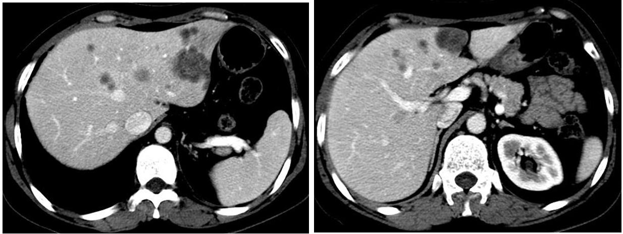 当时给予了患者药物去势联合三苯氧胺的内分泌治疗,约1年疗效为SD;2012年7月给予肺内转移灶和肿大淋巴结的放疗,放疗后复查发现肝脏出现多个新发结节,考虑肝转移。