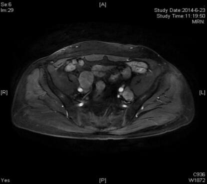 MRI:前列腺癌TURP术后,前列腺区仍见肿块,双侧髂血管旁多发小淋巴结。