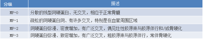 WHO 2016分型将原发性骨髓纤维化(PMF)分为纤维化早前期(prePMF)和纤维化明显期(overt PMF)。而按MF研究和治疗国际工作组(IWG-MRT)达成的共识,推荐使用PMF、真性红细胞增多症后MF(Post-PV MF)和原发性血小板增多症(ET)后MF(Post-ET MF)。首先是要明确骨髓中纤维化分级(表2)。