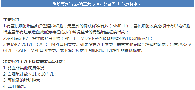 新标准降低了对血红蛋白、红细胞压积的要求,甚至提出部分病例不必骨髓涂片就能诊断PV,但诊断时骨髓纤维化仅能通过骨髓病理发现(约占诊断PV时的20%),而这类患者进展至post-PV MF非常迅速,故骨髓活检是必须的。
