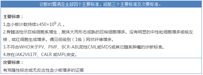 ET与prePMF鉴别开有重要意义,因为后者更易发展为显性纤维化和AML转化。而且,PMF的“三阴性(JAK2、CALR、MPL)”者预后差,而对于ET则佳。