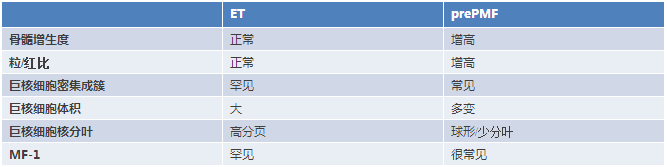 prePMF概念的提出,实际上使得既往一些可能诊断为原发性血小板增多症(ET)的患者被明确为是PMF。“真正”的ET患者年龄调整后的骨髓增生程度无或轻微增高,髓系和红系造血无显著增生,巨核细胞胞质和细胞核同步增大,体积大至巨大,细胞核高度分叶(鹿角状),嗜银染色纤维化分级常为MF-0;prePMF患者年龄调整后的骨髓增生程度显著增高,髓系造血显著增生,红系造血减低,巨核细胞细胞核体积的增大超过胞质,体积小至巨大,成簇分布,细胞核低分叶呈云朵状,嗜银染色纤维化分级常为MF-0或MF-1。