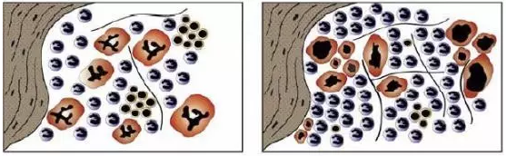 图2. ET(图左)和prePMF(图右)骨髓病理中增生度、巨核细胞形态和纤维组织分布差异