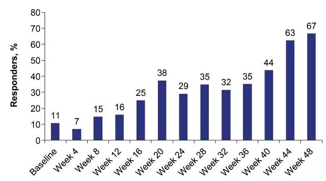本研究正是基于前期初步研究结果,在42例既往接受过两种方案以上的cGVHD患者中进行的二期临床试验。研究发现在平均随访13.9个月后,总有效率达到67%。75%的患者皮质激素减量至<0.15 mg/kg/天,甚至部分病人停用激素。几乎所有患者cGVHD严重度评分均有下降。药物的不良反应与在淋巴增殖性疾病中观察到一样。