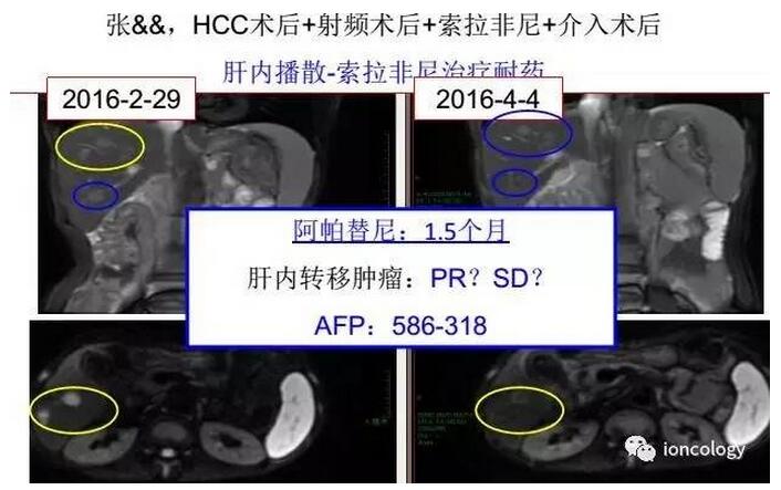 除肝癌术后复发的患者外,阿帕替尼用于初治的晚期肝癌的疗效如何呢?令人惊喜的是,针对一例合并门静脉及肠系膜上静脉癌栓、黄疸和腹水的肝癌患者,一线阿帕替尼治疗3个月后,原发灶和癌栓均有缩小,疗效评价为SD,无进展生存时间已超过12个月。