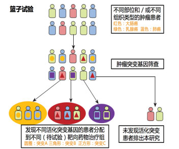 什么是“篮子试验”? 如下图所示,我们纳入不同部位、不同组织类型的肿瘤患者,对他们进行肿瘤突变基因的筛查,发现A、B、C三种突变型,然后将不同活化突变基因的患者分配到不同(待试验)靶向药物治疗组中,将未发现活化突变患者排出本研究,这就是篮子试验的模型。