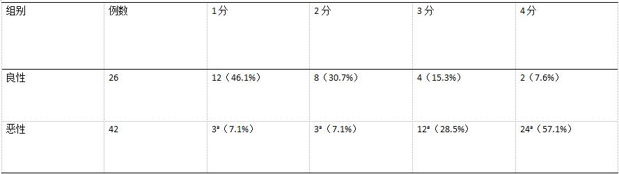 应用此评分系统对良恶性肿瘤淋巴结弹性评分结果罗列如下: