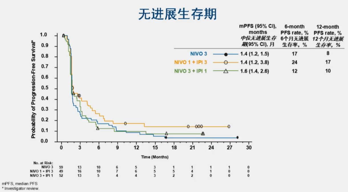 共入组160例患者,分为3组:nivolumab 3 mg/kg(59例),nivolumab 1 mg/kg+ipilimumab 3 mg/kg(49例)和nivolumab 3 mg/kg+ipilimumab 1 mg/kg(52例),三组患者的基线特征均衡。值得注意的是,3线或以上治疗的患者比例,3组分别为49%,46%和38%。主要研究终点ORR,nivolumab单药组ORR 12%,NIVO1+IPI3组最高,ORR为24%