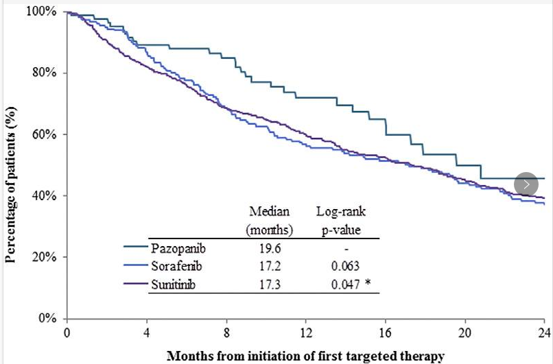 Jose Manuel Ruiz-Morales等完成的一项基于国际mRCC数据库联盟(IMDC)的真实世界分析表明:舒尼替尼与培唑帕尼一线治疗mRCC的有效性相似,且不影响随后的二线治疗结局。该项基于人群的回顾性分析是迄今为止最大型的在真实世界中验证COMPARZ临床试验结果的研究,覆盖全球29家癌症中心的患者数据,包括加拿大、美国、澳大利亚、丹麦、比利时、希腊、意大利北部、波兰、日本、新加坡、韩国和新西兰。