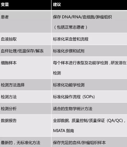 我们从前期发表的一些临床试验得到一些启示。首先,我们需要严格将生物样本按照标准条件保存。很多临床试验的样本库仅保存了一些无用的肿瘤组织或血细胞碎片。保存欠佳的生物样本只会向研究者提供不可靠的信息,继而干扰后续研究。其次,免疫学检测花费昂贵,小规模样本研究很难提供有效的生物学重复,从而可能让研究者错过一些重要的生物标志物。基于以上现状,iSBTc-SITC/FDA/NCI学会为免疫治疗的生物标志物研究提供了以下建议:
