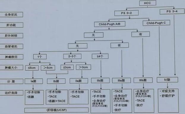 依据中国的具体国情及实践积累,推荐下述分期方案,包括:Ia期、 Ib期;IIa期、 IIb期;IIIa期、 IIIb期;IV期,为全身状态相对较好,但肿瘤数目较多(≥4个)或较大(>5 cm)甚至血管侵犯的病人提供了手术治疗或RFA等根治机会,大大改善预后。