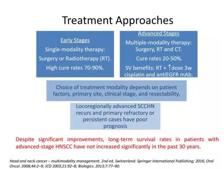 Patricia Piedra Sierra教授首先介绍了头颈部鳞状细胞癌(SCCHN)这种异质性疾病,讨论了当前的治疗方法以及治疗获益和不足。早期患者采用手术或放疗,可达到70%~90%的治愈率。晚期患者采用多模态治疗(手术、放疗和化疗),治愈率20%~50%。Sierra教授最后总结道,尽管晚期SCCHN的治疗有明显改善,但过去的30年里患者的长期生存率没有明显增加1-3。