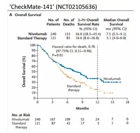 根据CheckMate-141研究,nivolumab治疗复发性/转移性SCCHN 不仅在疗效和总生存都超过标准疗法,而且耐受性更好,患者生活质量更优。与传统的解救药物相比,nivolumab改善了肿瘤缓解率(RR)(13.3% vs.5.8%),且显著延长了中位OS(7.5个月vs.5.1个月)和1年生存率(36% vs.16.6%)。PD-L1≥1%或P16阳性患者的改善幅度似乎更大,但交互作用不显著,在PD-L1<1%和P16阴性患者中也观察到治疗反应5-6。