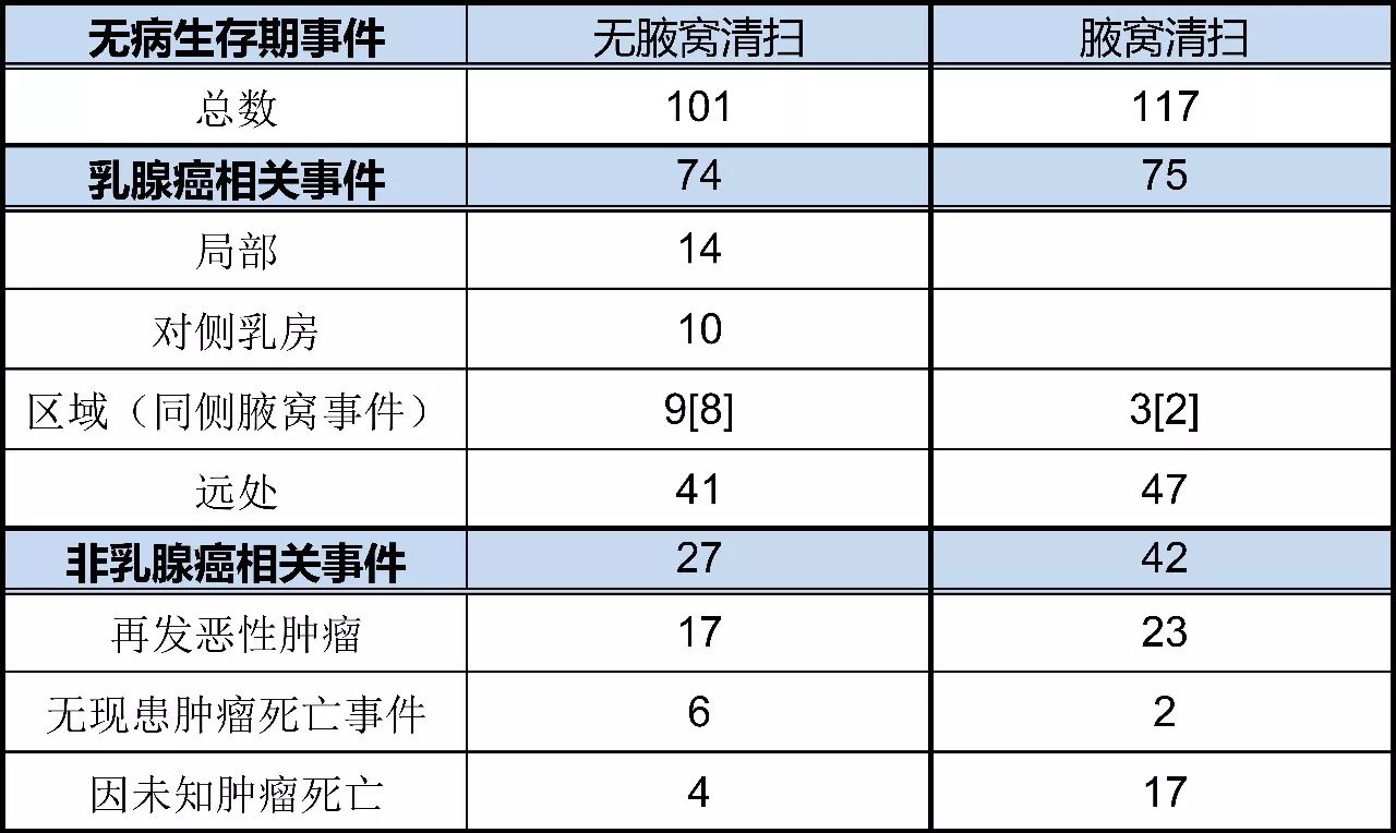 结果:从2001年到2010, 来源于27个中心的共934名患者被纳入研究;最终评估了931名患者(无腋窝淋巴结清扫组467名,腋窝淋巴结清扫组464名)。中位随访时间为9.8(IQR:7.8-12.7)年。表中(见下表)列举了各组发生DFS事件的数量和类型。
