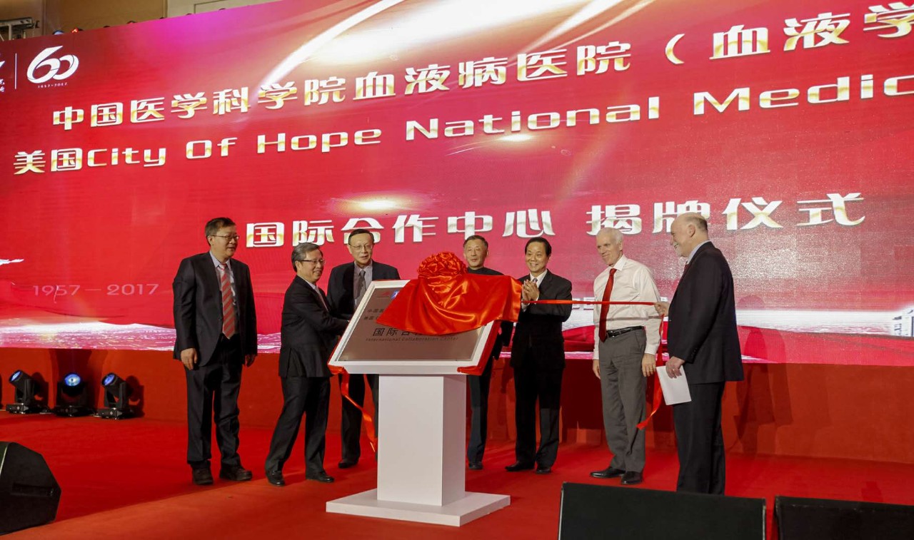 中国血液病专科联盟的成立,不但将加强全国各地成员单位的交流合作,同时会面向世界,积极拓展国际交流与合作。City of Hope National Medical Center所长兼首席科学官Steven Rosen教授、国际部Edwin McCarthy总裁、Sun Zijie教授等远道而来,与中国医学科学院血液病医院(血液学研究所)党委书记常子奎、常务副院所长程涛、副院所长王建祥、副院所长肖志坚等共同为 “中国医学科学院血液病医院&美国City of Hope National Medical Center国际合作中心”揭牌。