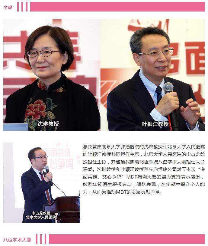 总决赛由北京大学肿瘤医院的沈琳教授和北京大学人民医院的叶颖江教授共同担任主席,北京大学人民医院的申占龙教授担任主持,并邀请我国消化道领域八位学术大咖担任大会评委。沈琳教授和叶颖江教授首先向恒瑞公司对于本次“多面共铸、艾心争鸣”MDT病例大赛的鼎力支持表示感谢,鼓励年轻医生积极参与,踊跃表现,在实战中提升个人能力,从而为推动MDT的发展贡献力量。