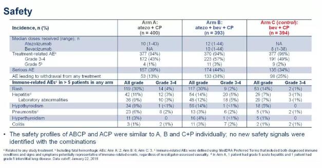 2)联合atezo治疗组,57%的患者出现了3~4度不良反应,这提示我们在实际使用这一治疗方案时,需要充分评估患者可能的获益及潜在风险,谨慎作出选择,同时进一步探索与疗效及不良反应有关的分子标志物,实现个体化治疗。