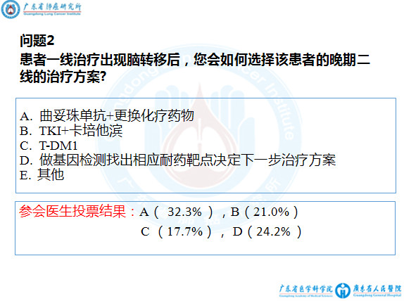 海外专家一致为该病例选择了继续“曲妥珠单抗+更换化疗药物”。Debu Tripathy教授认为此例患者发生的肿瘤进展主要为颅内转移,根据ASCO和NCCN等指南推荐,继续维持抗HER2基线治疗的基础上调整化疗方案是正确的。