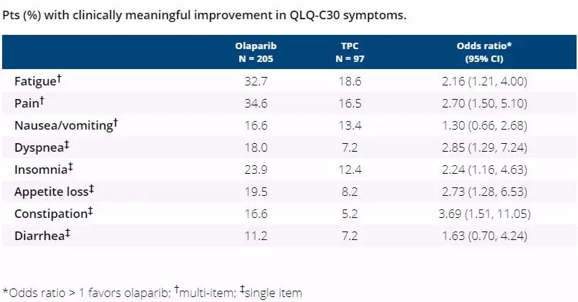 另一项研究同样基于OlympiAD,应用EORTC QLQ-C30 (QLQ-C30)生存质量问卷调查评估患者治疗后相关药物副作用。Olaparib组患者在劳累、疼痛、恶心/呕吐、呼吸困难、失眠、食欲丧失、便秘和腹泻等相关反应的表现均优于化疗组(表2)。