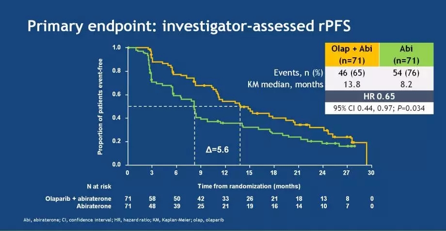 方法:多西他赛治疗后mCRPC患者随机(1:1)接受奥拉帕利300mg bid(片剂;联合组)或安慰剂(对照组)加阿比特龙(1000mg od)治疗,直至疾病进展。主要终点是研究者评估的影像学无进展生存期(rPFS; RECIST 1.1, PCWG-2)。