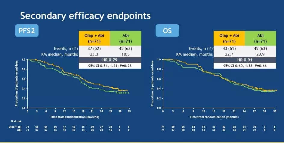 结果:142例患者(中位年龄69岁)被随机分组并治疗(两组均为71例)。总体上联合组相比对照组显著增加rPFS(13.8 vs. 8.2月; HR=0.65; 95%CI 0.44~0.97,P=0.034)。无论HRRm状态如何,联合组均提示rPFS获益。联合组和对照组中位OS分别为23.3 vs 20.9个月(HR 0.89,95%CI 0.58~1.35);分别有54%和28%的患者发生≥3级不良事件;34%和18%的患者报告严重不良事件,联合组存在更多心血管不良事件;30%和10%的患者由于不良事件而停止治疗。生活质量恶化的中位时间(QoL; FACT-P)分别为5.7和6.0个月(HR 0.97,95%CI 0.68~1.40)。